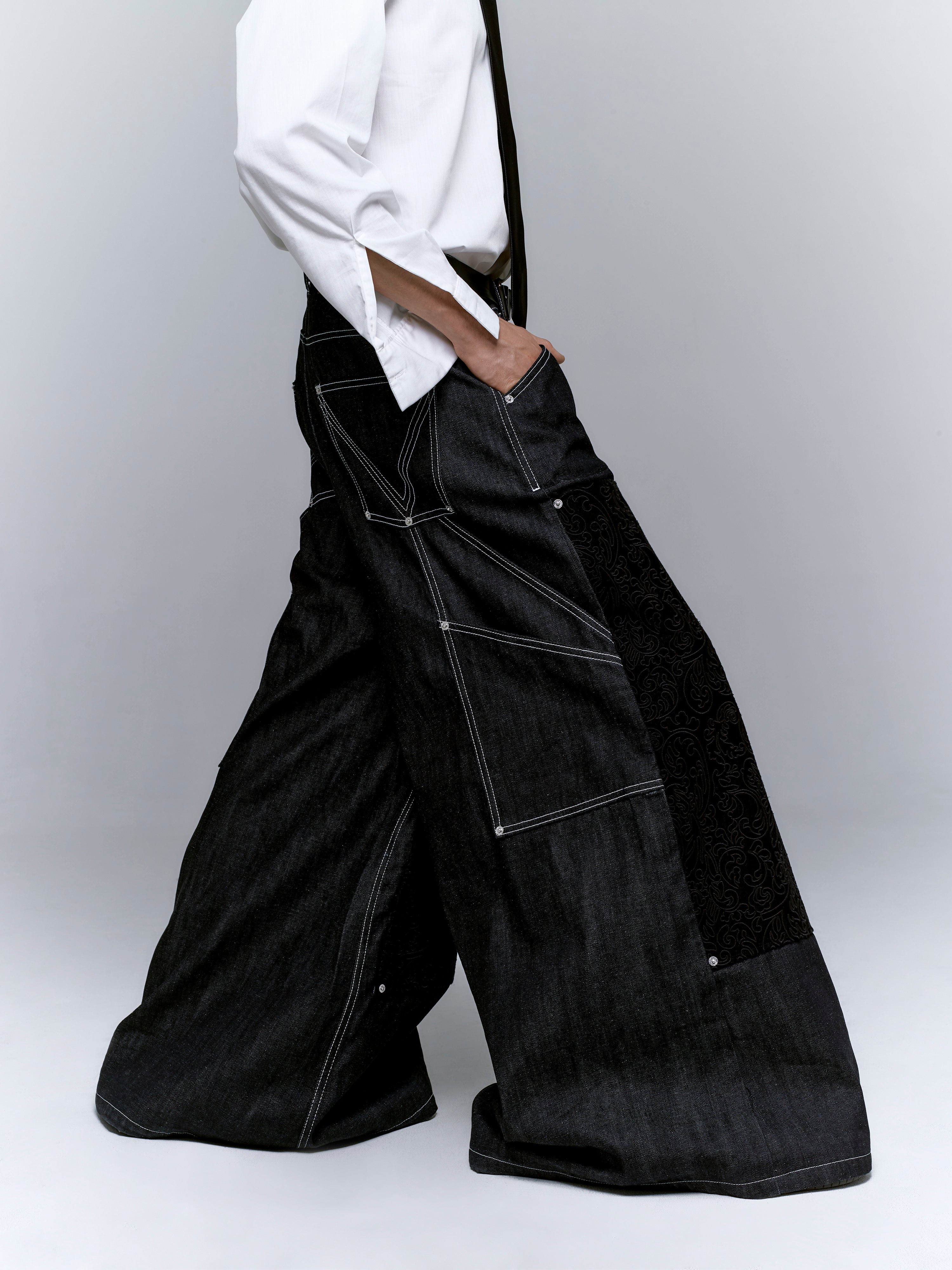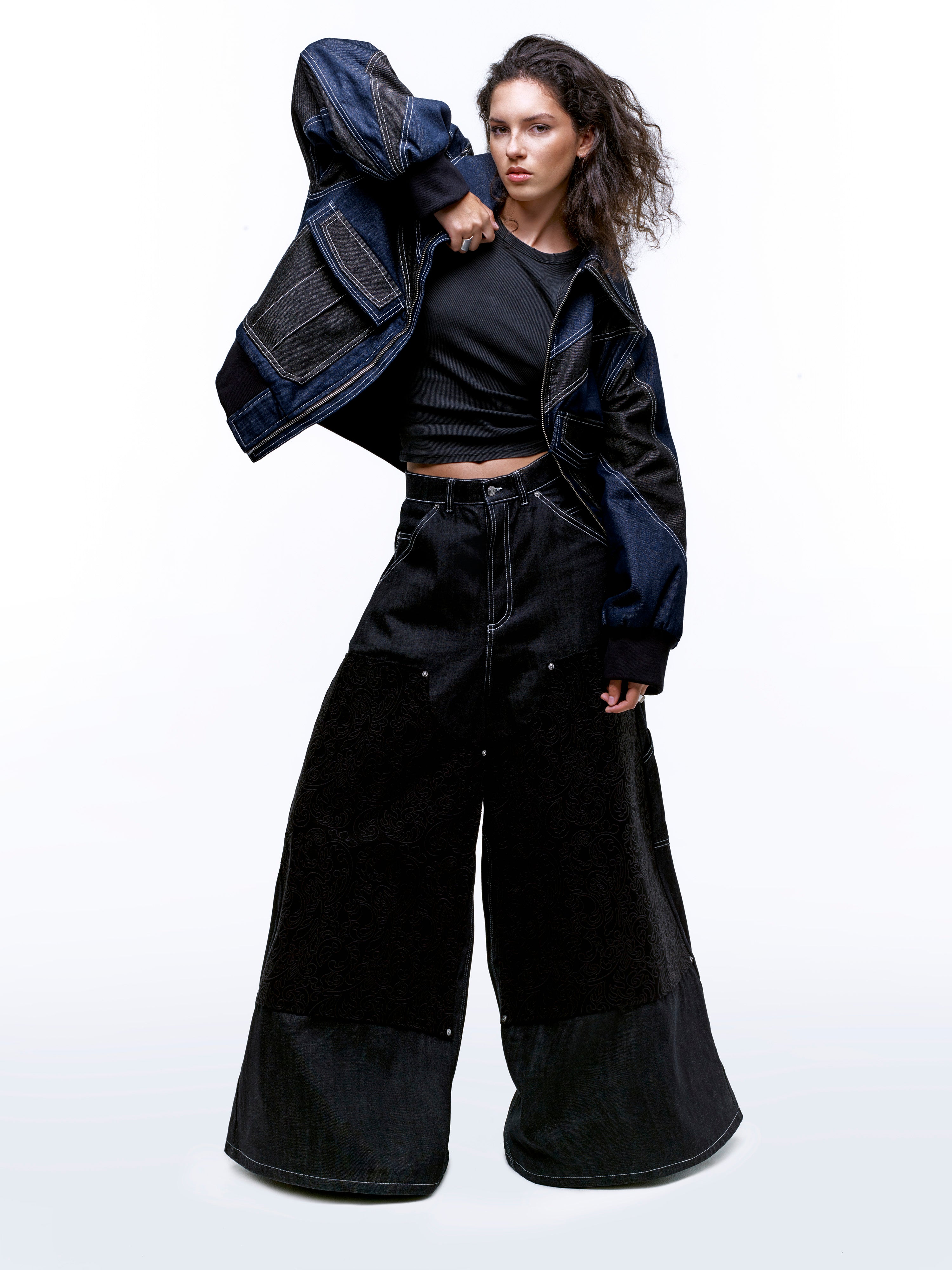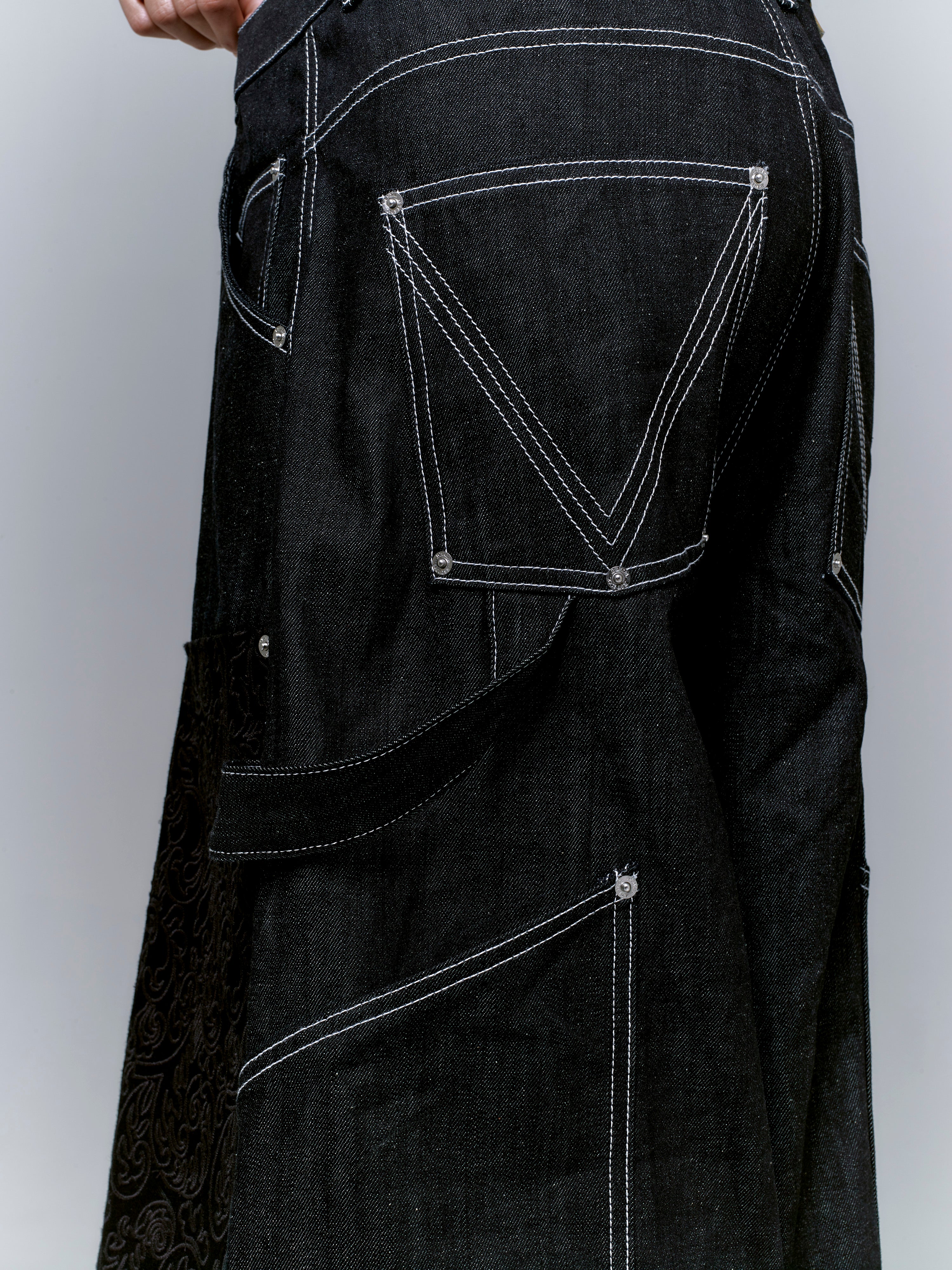 Fabric: 14oz raw denim; contrast embroidered overlay panels
