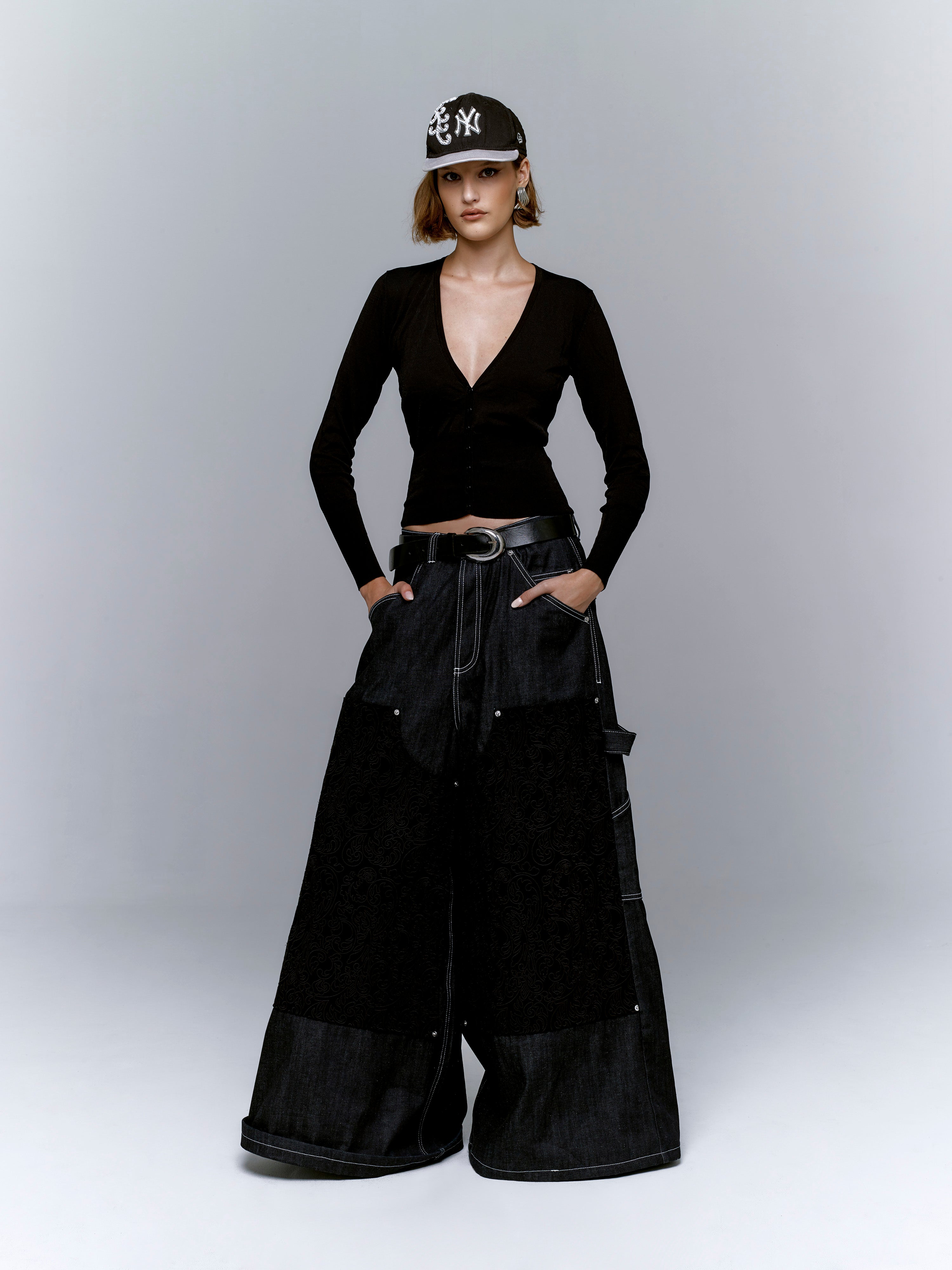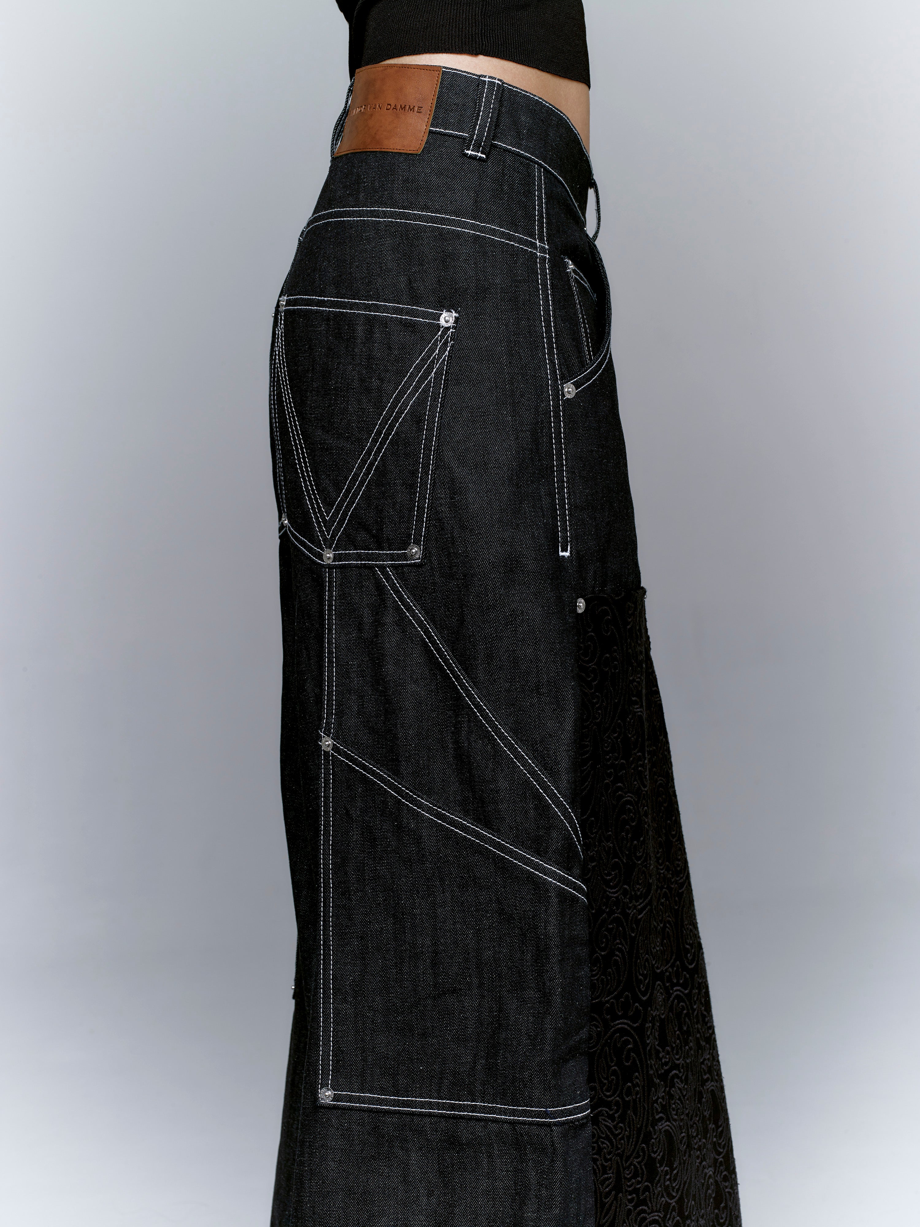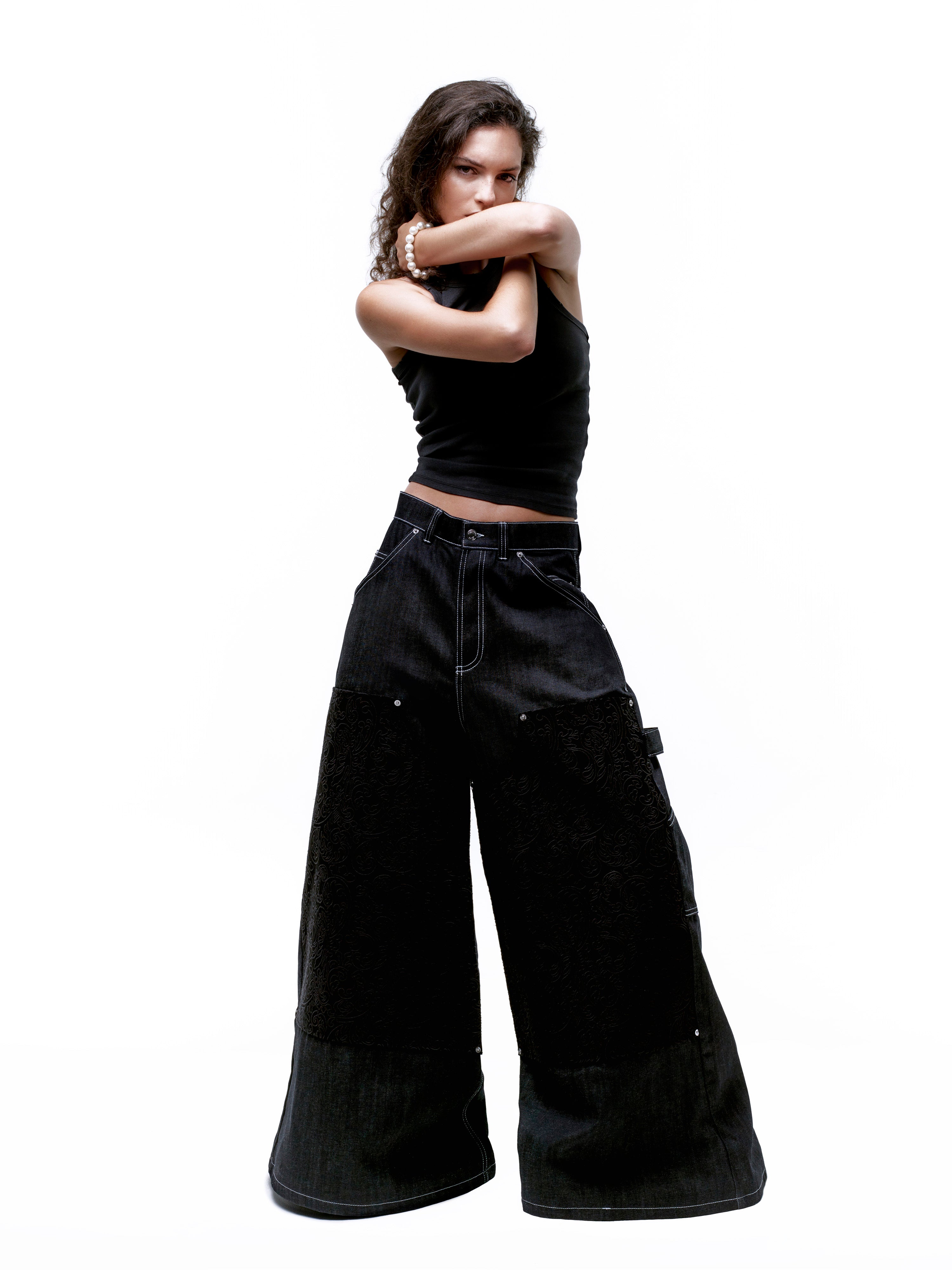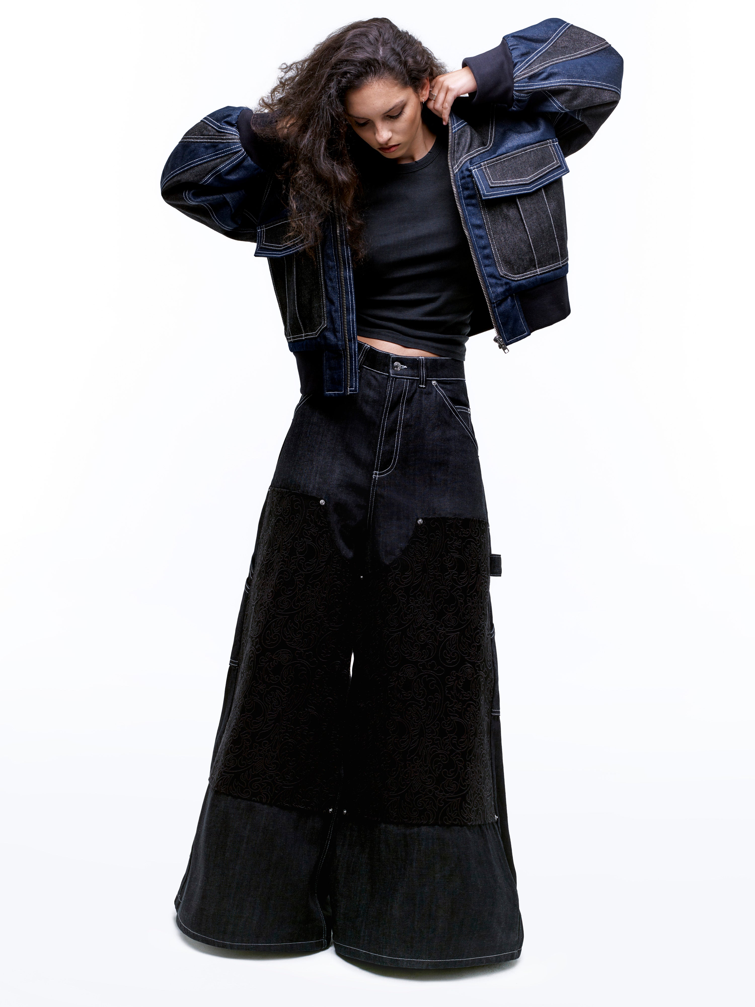 Fabric: 14oz raw denim; contrast embroidered overlay panels