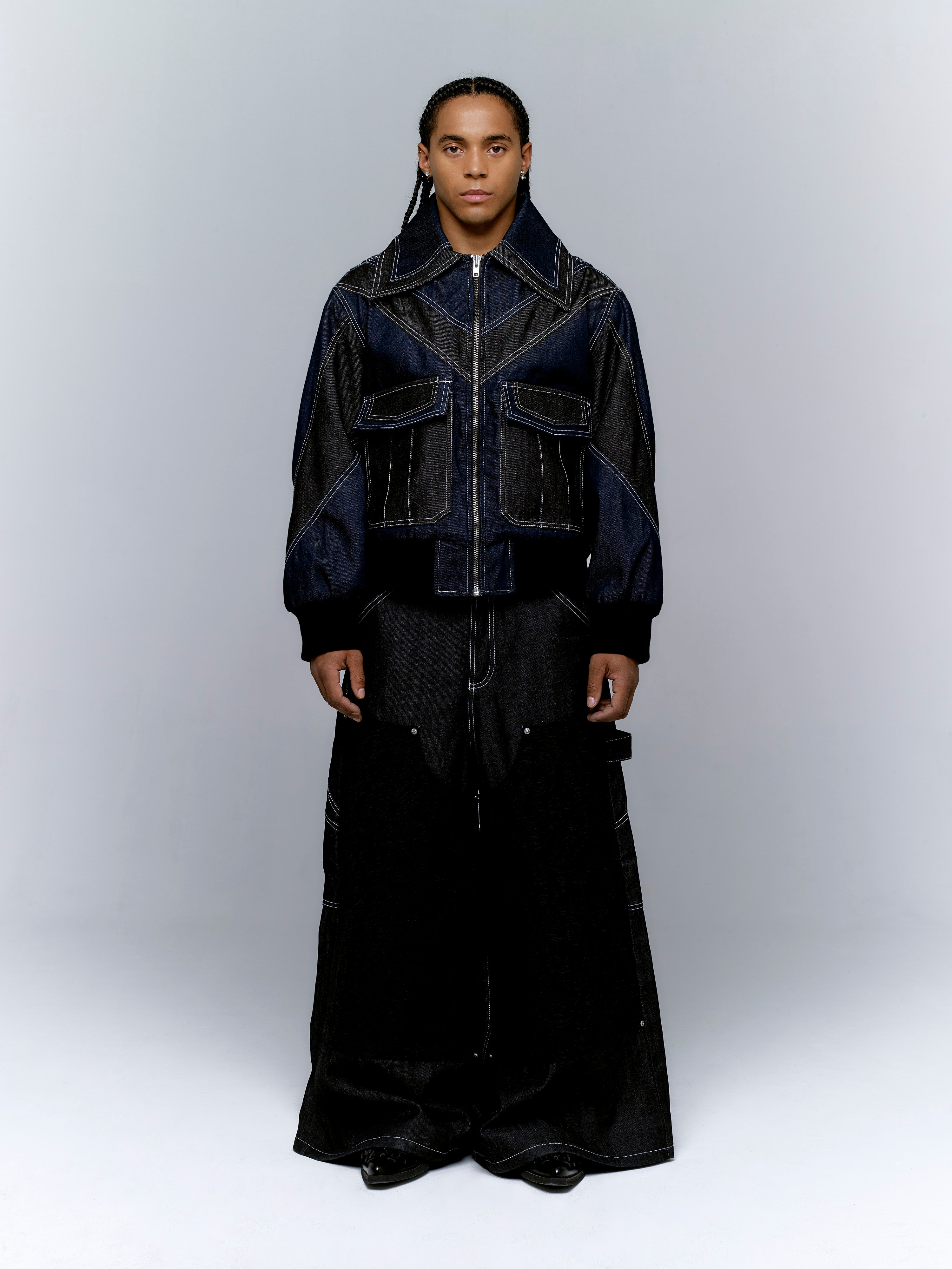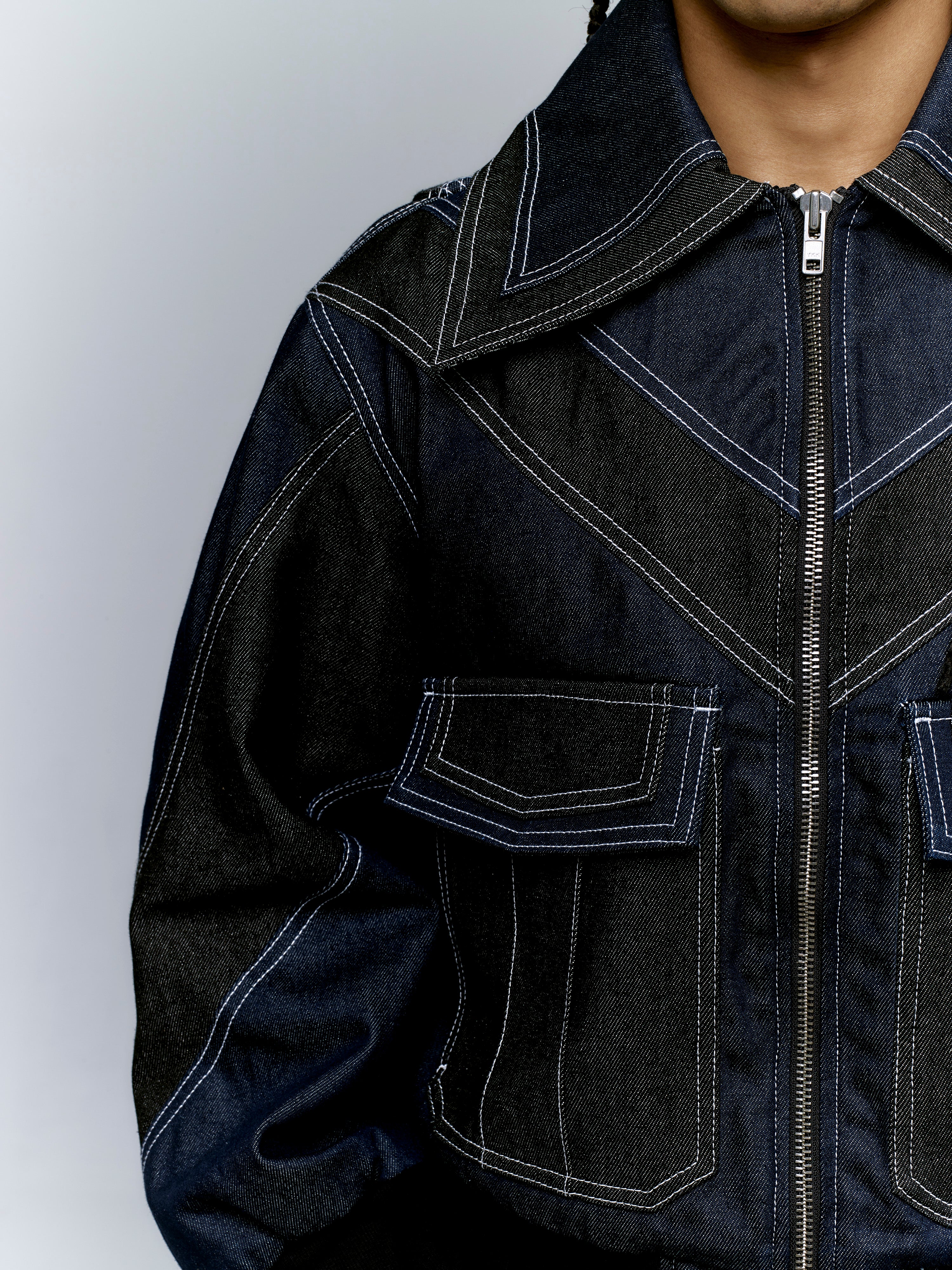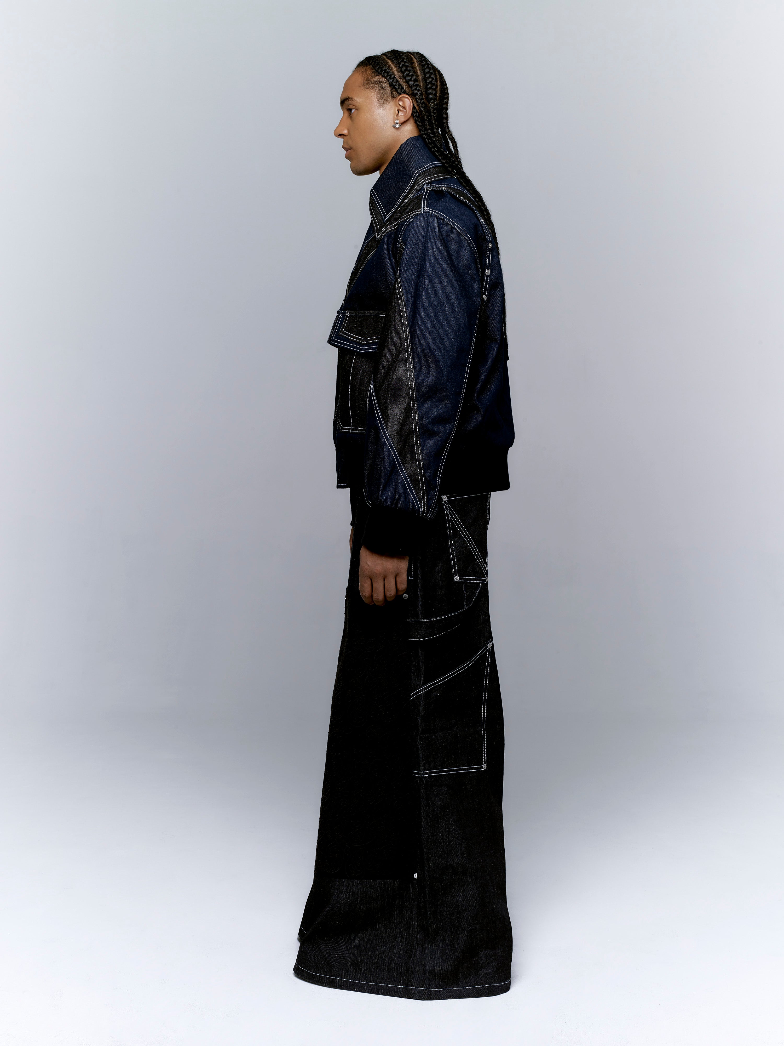 Shell: 14–16oz raw denim, indigo + charcoal paneling