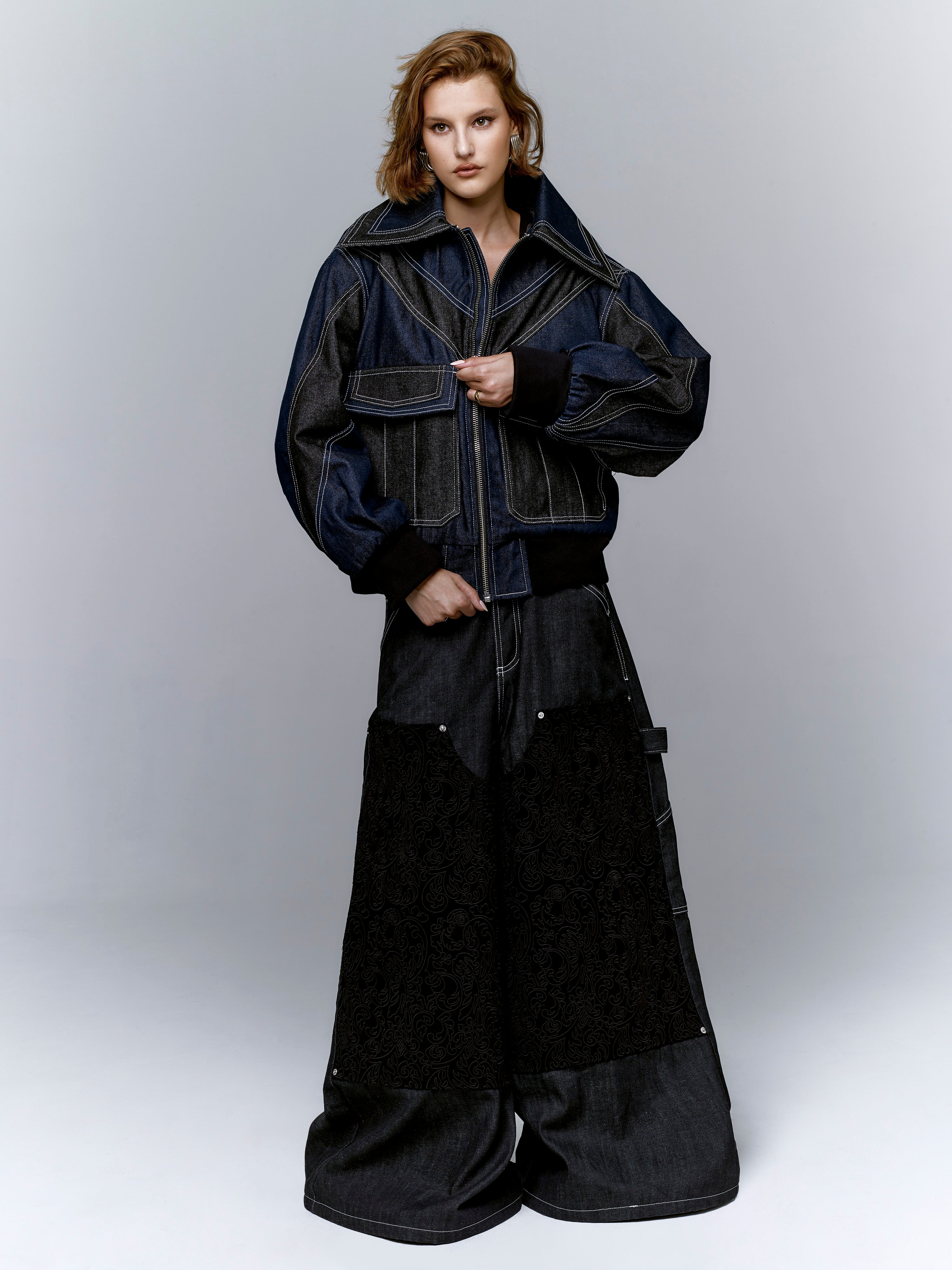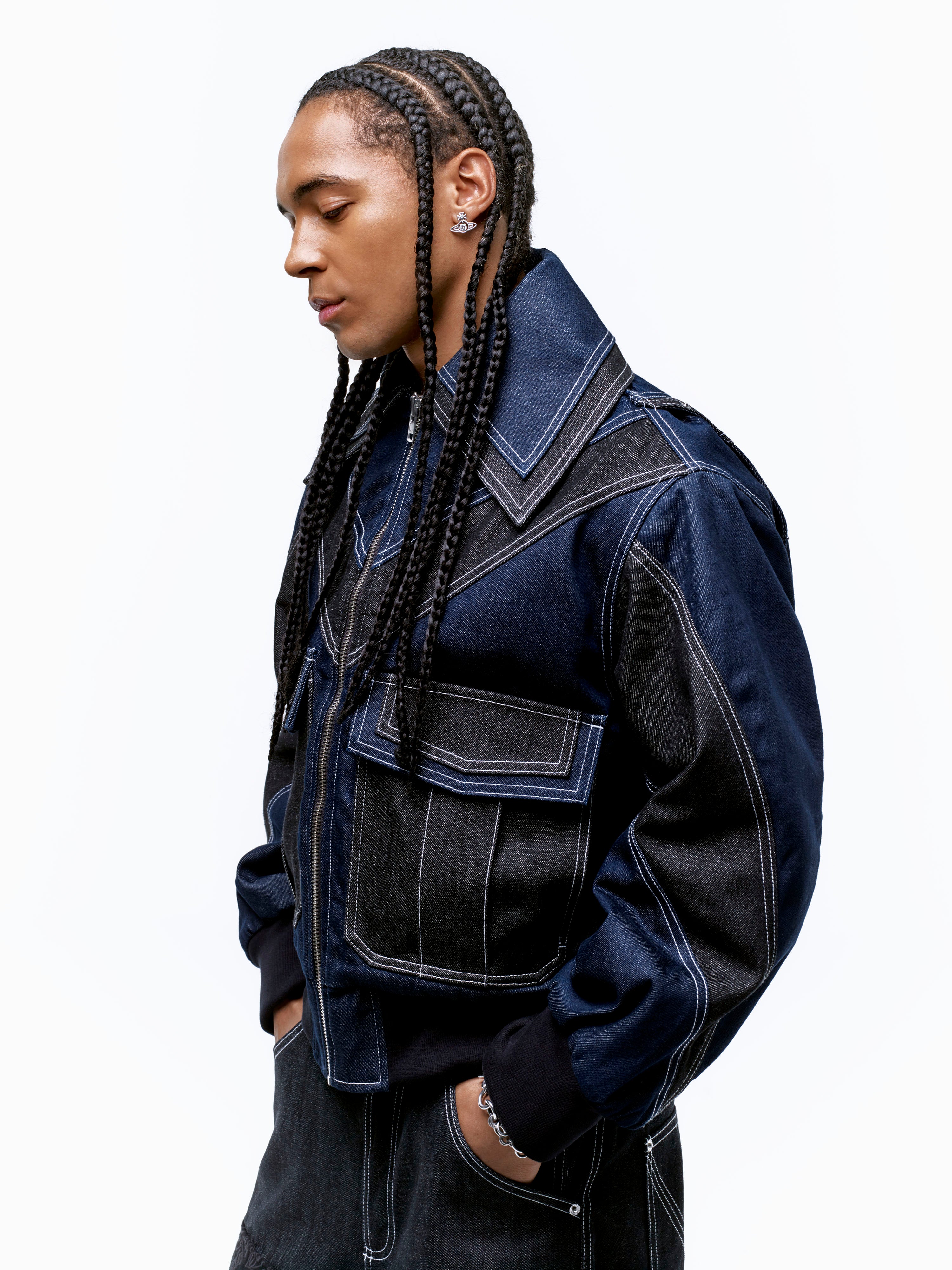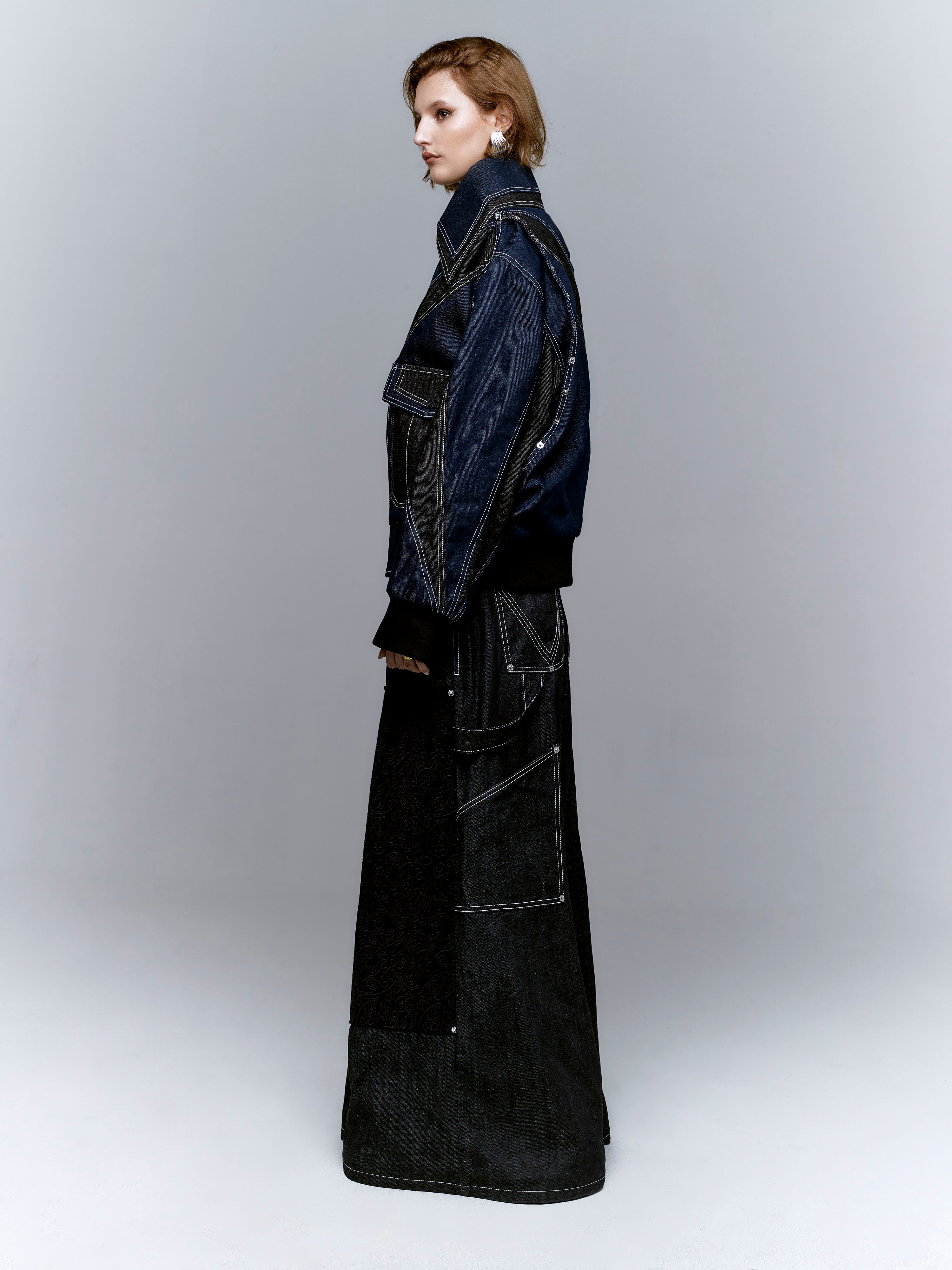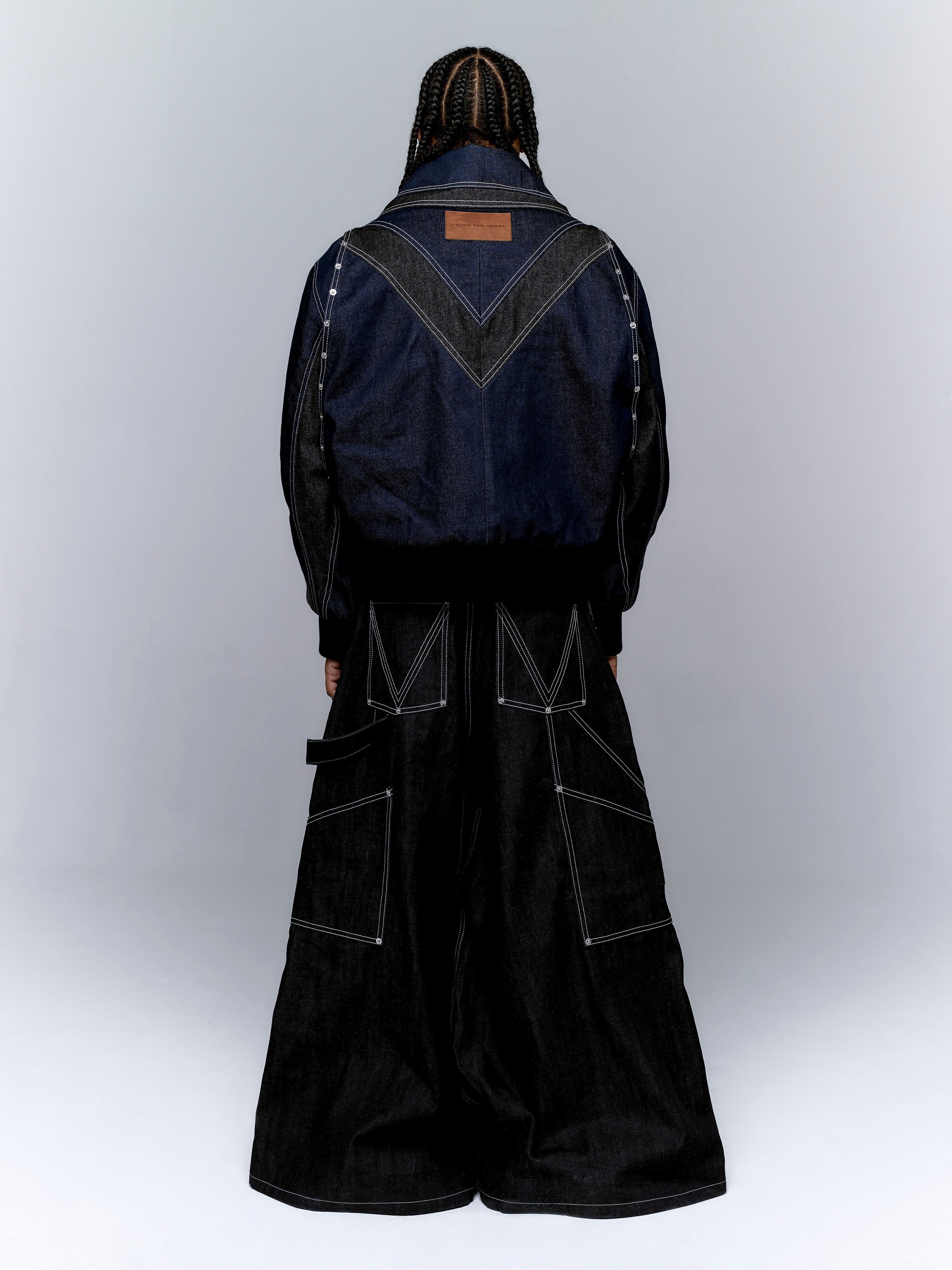 Shell: 14–16oz raw denim, indigo + charcoal paneling